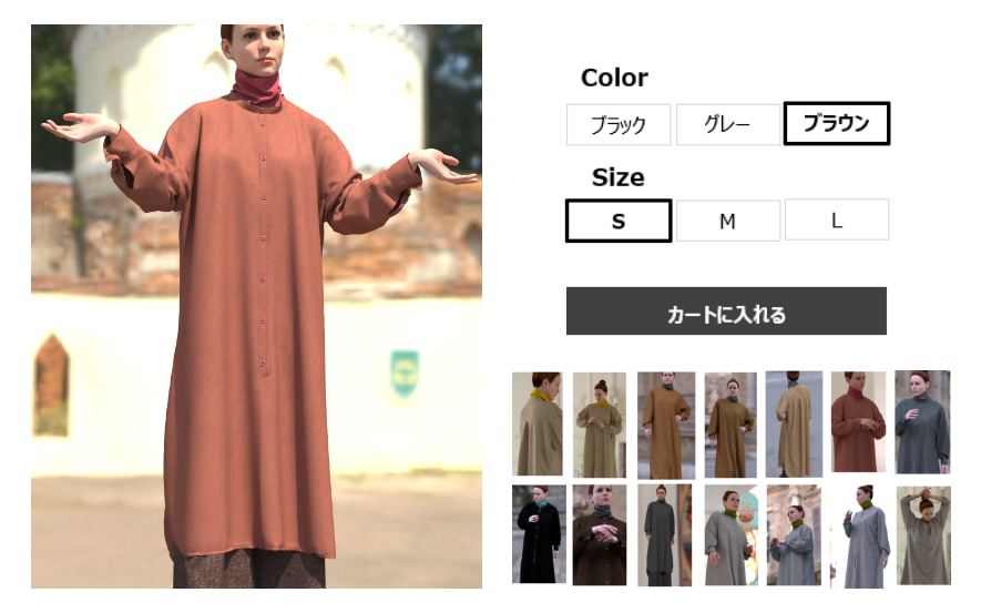 商品のサイズ感や各色パターンを掲載することでECでの購買を後押しします。